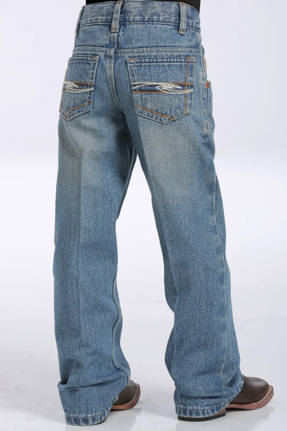 Medium stonewash, Hand sanding, Whiskers, Adjustable waistband, 12 oz. denim