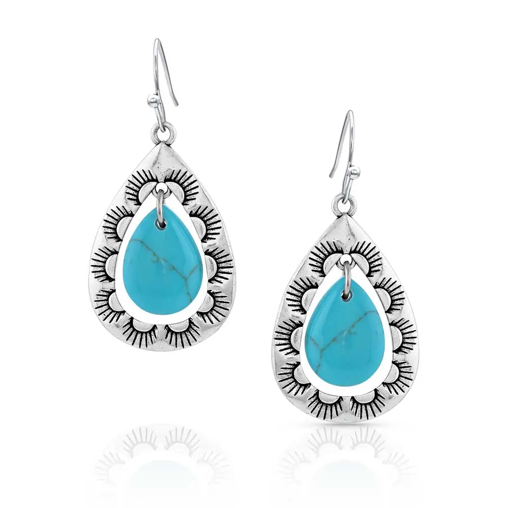 We love earrings that could be from your grandma’s jewelry box and passed down the family or brand new to your own jewelry box. The Roadrunner Turquoise Scalloped Earrings are just that! They dangle from hypoallergenic French hooks and hold a silver-toned teardrop shape dangly earring. They are simple and adorned with scalloped etchings for a classic country western look. They have a pop of color with turquoise stone in the center. If you want something a little more simple, look at our Roadrunner Silver Scalloped Earrings for this design but without a stone in the middle.