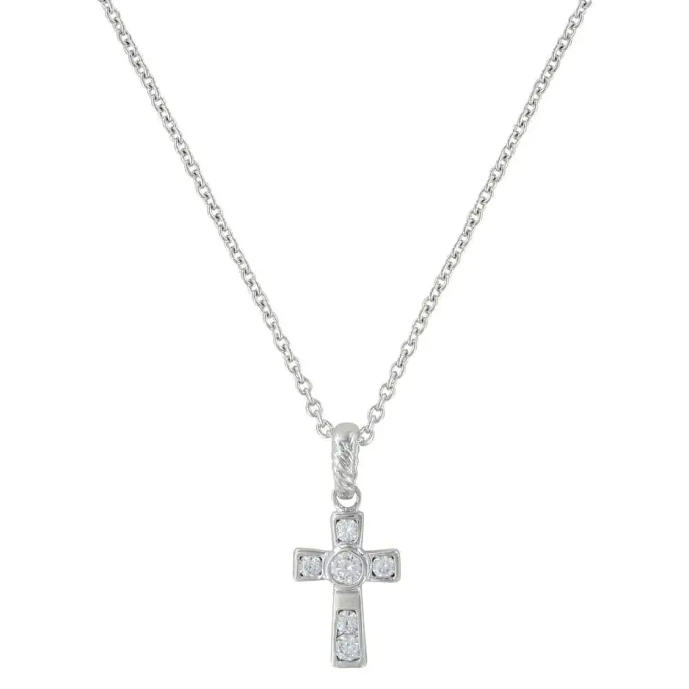 Just like the name this necklace shines bright in its simplicity. The end of each limb of the cross is set with brilliantly clear rhinestones that changes to a shining bright silver finish that all connects with one perfectly round faceted rhinestone. Necklace pendant hangs from a 19 inch princess length chain.