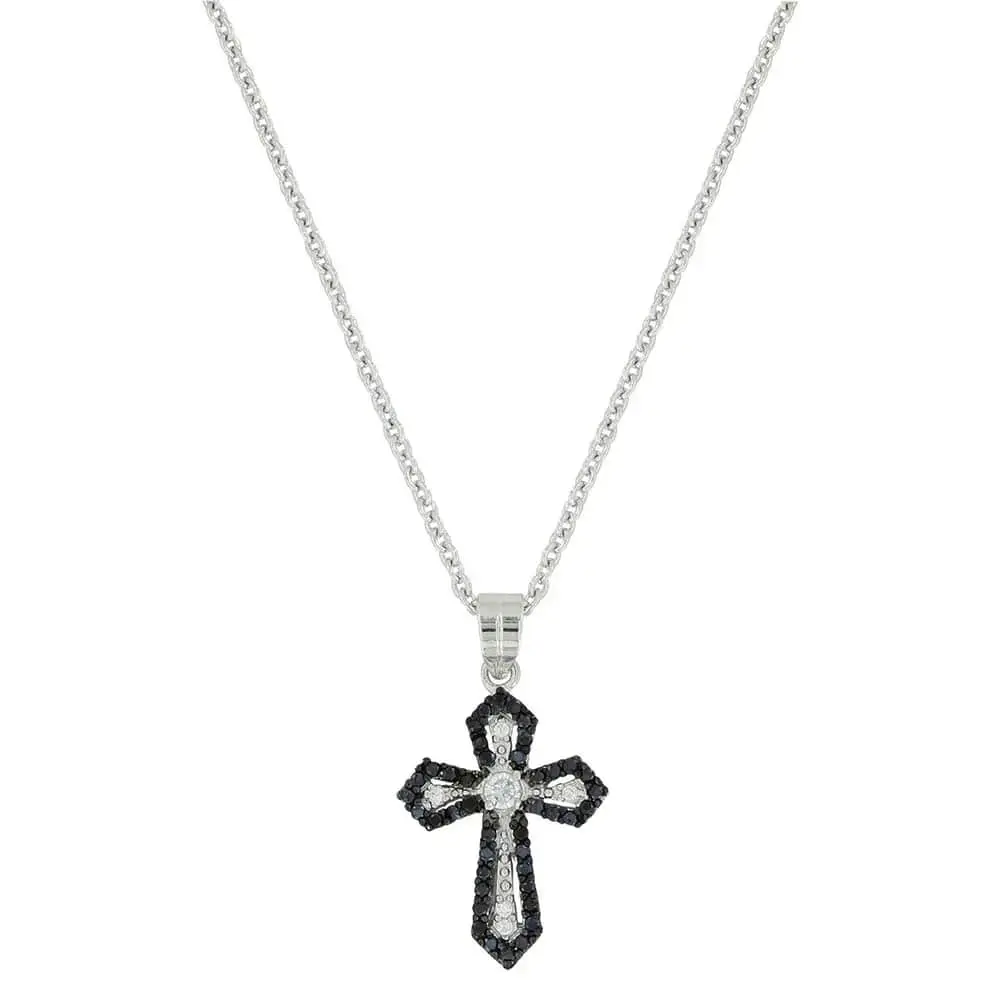 Everything is black and white for a defined flared cross pendant. A cross necklace pendant with an outline of black stones creates a definite edge for the clear stone center. Pendant hangs on a princess length 19 inch chain.