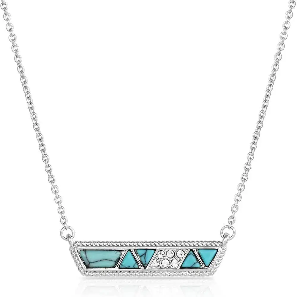 Fall in love with this stunning silver tone, crystal, and turquoise bar necklace. The beautiful shape and design are sure to lend a unique touch to any outfit. The bar necklace is filled with a beautiful cobblestone design of turquoise stones and a section of small clear cubic zirconia stones to add an extra touch. The necklace is finished by a 19 inch silver tone split chain. Pair this stunning necklace with the matching High Noon Cobblestone Turquoise Earrings for a polished and sophisticated look.