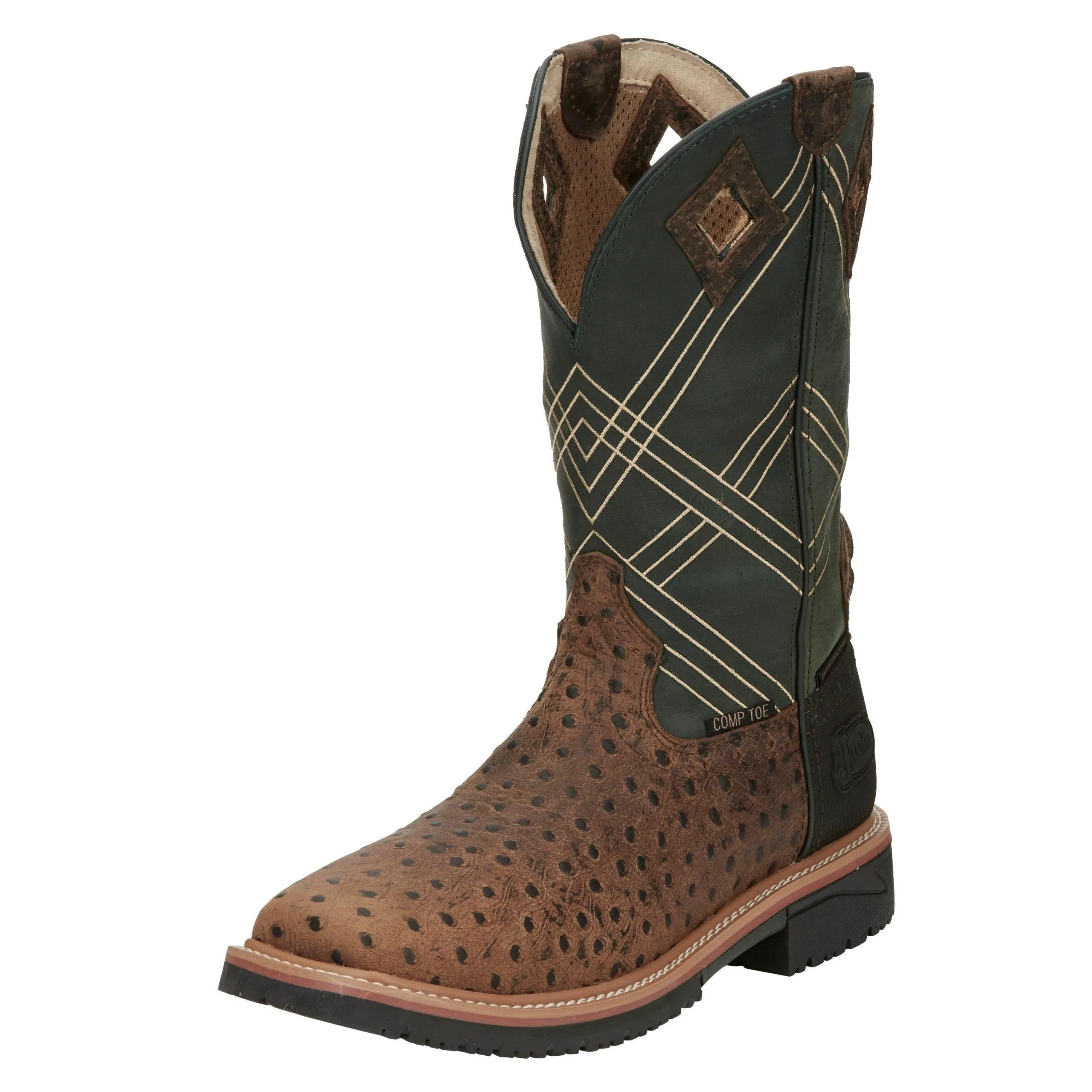 This Nano Composite square toe work boot by Justin Boot Company is a work boot that features a striking Hunter Green upper with bold stitching. The exterior is water-resistant and the traditional silhouette provides a classic cowboy boot feel. The Ortholite insole provides lasting comfort complementing the Vibram Commander-X5 rubber outsole that is oil and slip resistant providing stability on various terrain, so this boot is prepared to get the job done.