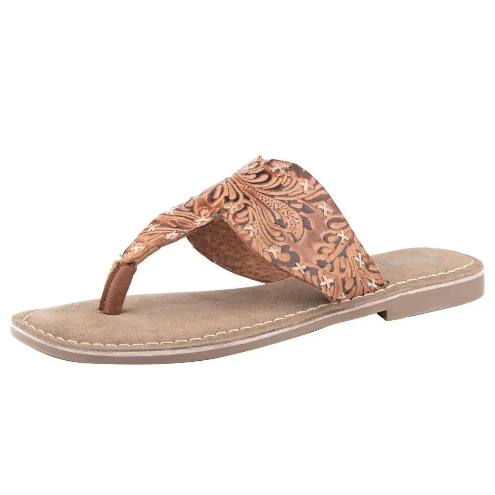 Roper Ladies’ Tan Floral Embossed Leather Sandal.