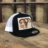 Black front, white mesh back. 4 inch crown. Black and Red Diamond Hereford patch.