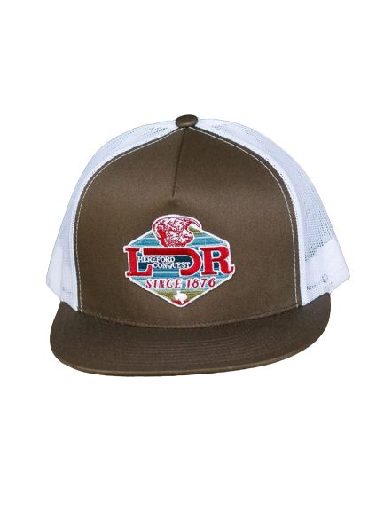 Lazy J Ranch Wear Brown front & White mesh back. 4″. Conquest Patch. One size fits most.