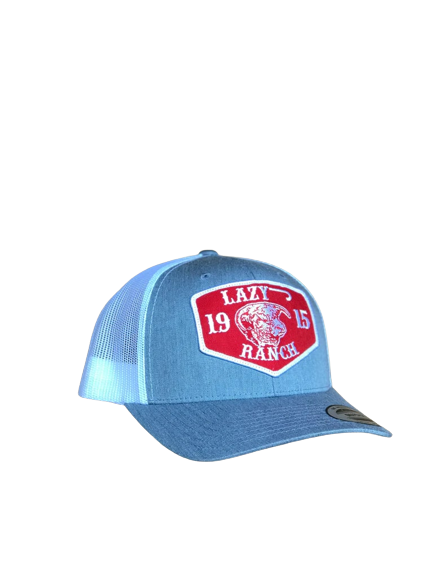 Lazy J Ranch Wear Heather front and White mesh back. 3.5 inches. Red Ranch Patch. One size fits most.