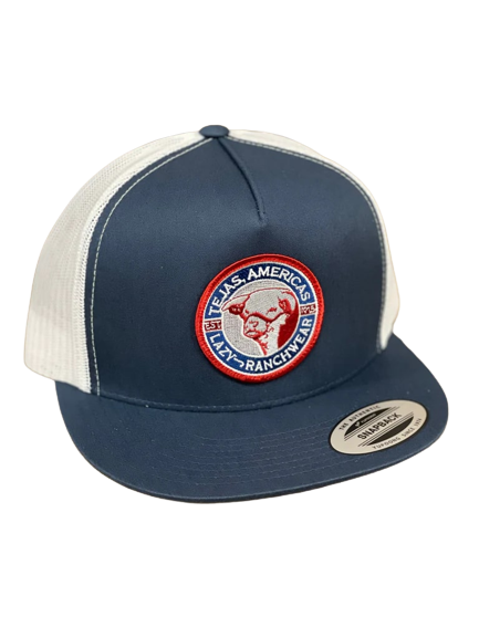 Lazy J Ranch Wear Navy front and White mesh back. 4 inches. Tejas Patch. One size fits most.
