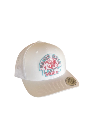 Lazy J Ranch Wear Red, White & Turquoise Arrowhead patch Cap. White front, white mesh back. 3.5 inch crown.