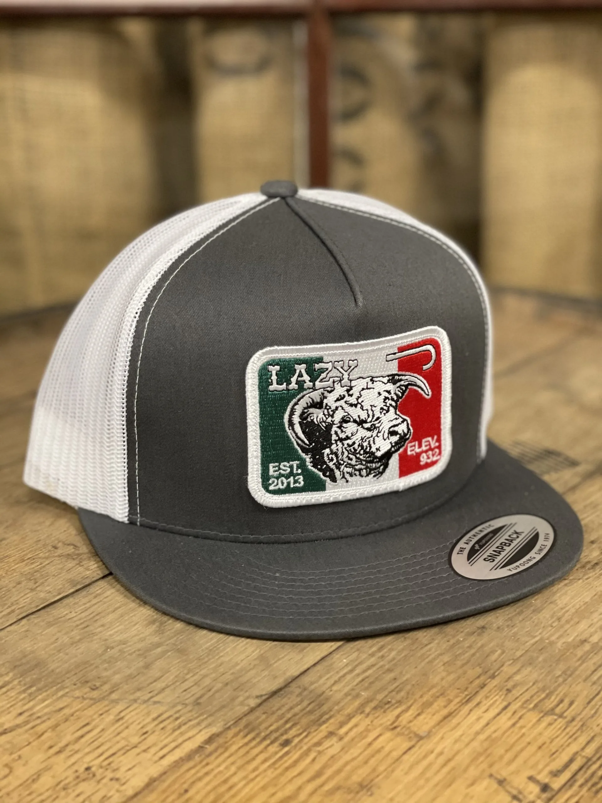 Lazy J hat features the Mexico Bull Patch, flat brim and Snapback on a grey and white background. One size fits most. black front, black mesh back. 4 inch crown.