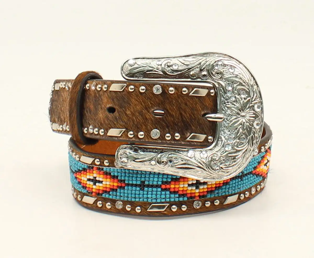 Stylish girls Ariat™ belt by M&F Western Products®. This belt features a multi- colored beaded center with nail heads and rhinestone conchos. Available in sizes 18- 28.