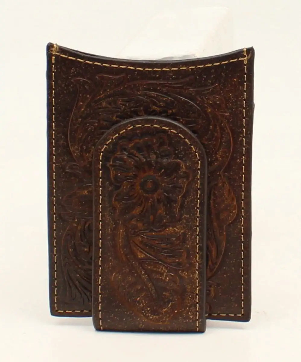 This leather AriatTM money clip wallet by M&F Western Products® features a beautiful western floral embossed pattern. Inside consists of credit card slots, money slots, and a place for your ID.