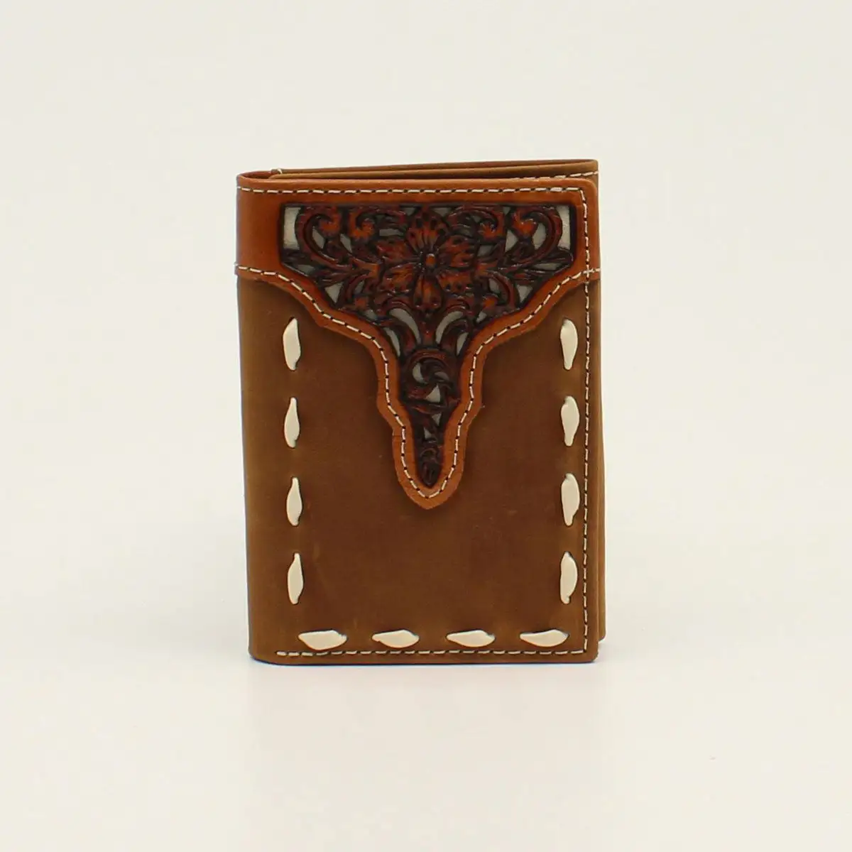 Stay organized with this trifold style Ariat wallet by M&F Western Products. Genuine leather with a floral tooled overlay with contrast buck stitching around the edges. Features compartments for your credit cards, cash and ID.