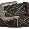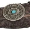 This boy’s Nocona Belt Co. tooled bull rider black belt has white stitching on the top and bottom. It comes with a silver buckle with a gold image of a bullrider.