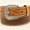 Durable enough for the workday, but stylish enough for evenings, this Nocona mens belt by M&F Western Products is made of genuine leather and features a scrolled pierce strap with a lighter tan underlay. The belt is tapered and the edges have a leather lacing. The silver engraved buckle is removable should you want to create your own style. Great belt for the cowboy who wants to look his best. Available in sizes 32- 46.