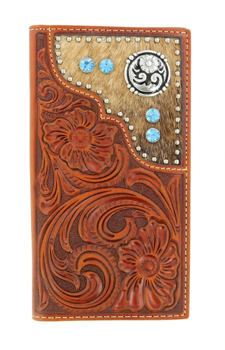 This Nocona Leather rodeo wallet by M&F Western Products® is great for the modern cowboy. This beautiful leather wallet is embossed with a floral pattern and is accented with blue rhinestones and calf hair for a very sophisticated look. Inside features multiple compartments for your credit cards, cash, and an ID window.