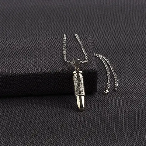 Men’s Silver Strike necklace by M&F Western Products. 2 inch bullet pendant with floral engraved design. 24 inch chain that is hand engraved and has an antique shiny silver finish.