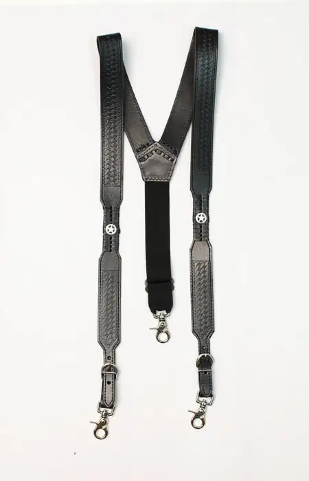 GallusBKembW/This gallus by M&F Western Products® features an embossed basketweave pattern and a silver lone star concho. Adjustable to get that perfect fit. These leather galluses attach to your pants with metal trigger snaps that secure to your belt loop. Available in sizes: M(28”), L(30”), XL(32”).