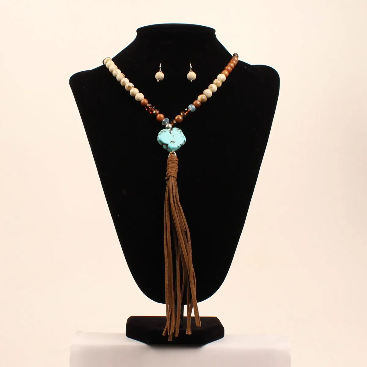 This beautiful Blazin Roxx necklace set is by M & F Western Products® and features a fringe necklace with natural colored beads. It also has a large turquoise stone with hanging fringe and matching earrings. This is a very unique piece you will want in your collection.