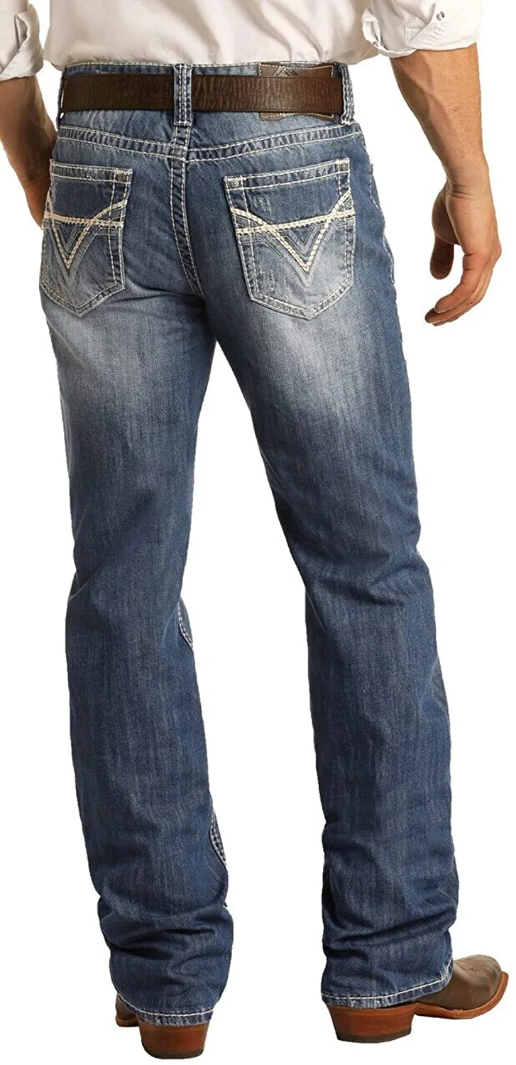 - Medium vintage wash with raised, large “V” embroidery