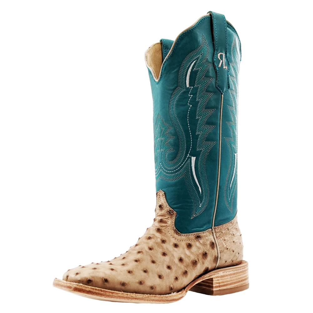 R. Watson presents these sand bruciato full quill ostrich and teal sinatra cowhide western boots. These boots have a 10 row stitch pattern, R. Watson comfort system, all leather stacked heel, counters, solid steel shank, and 10 iron outsole. 13″ total in height.