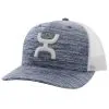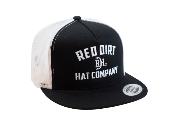 Black and white 5 Panel style snapback cap featuring white embroidery.