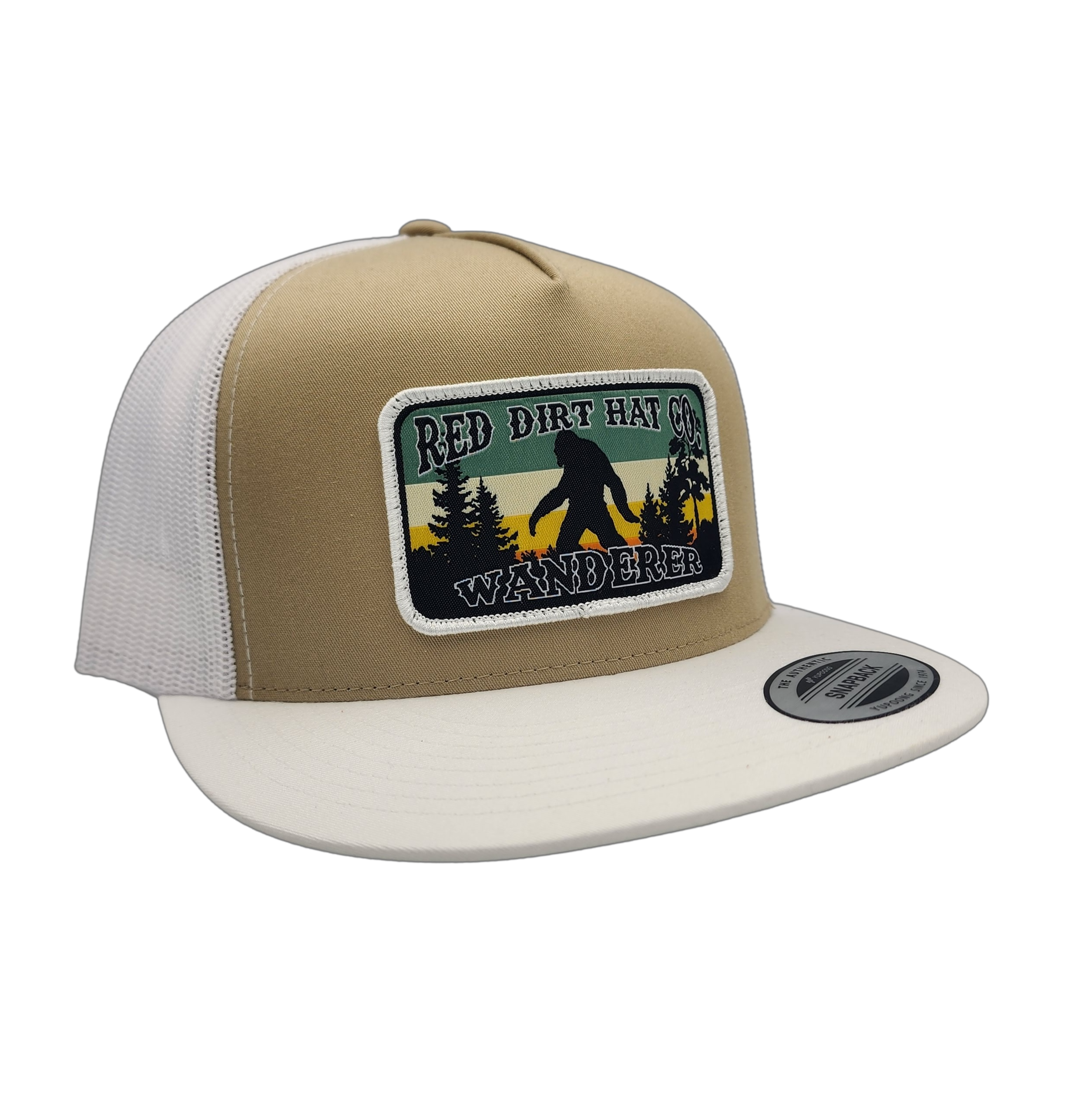 Description: Custom white/khaki/white flat bill style snapback cap featuring the new and exclusive “Wanderer” patch