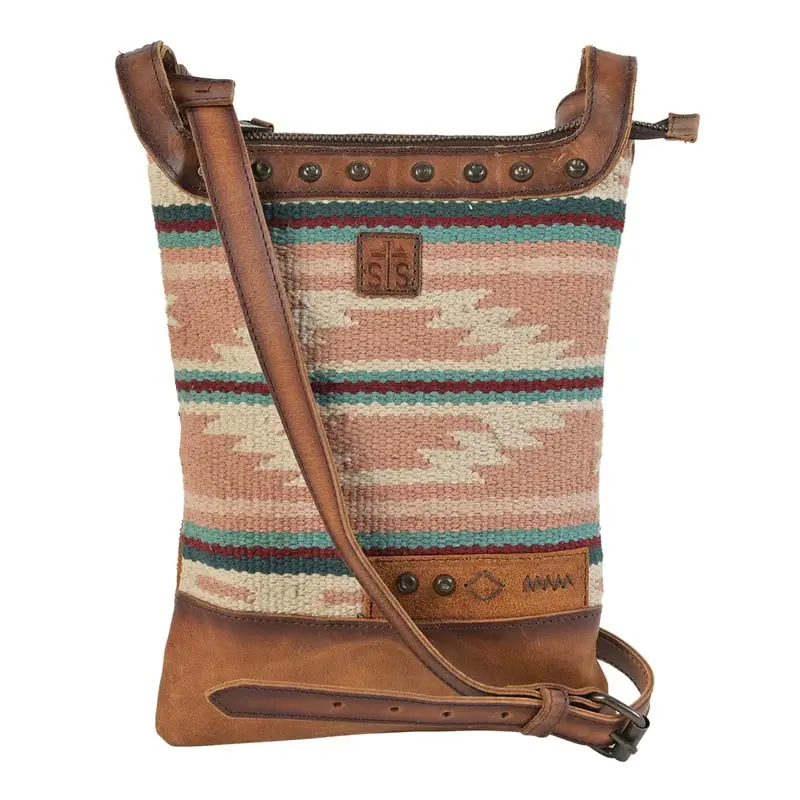 The Palomino Crossbody features Aztec woven serape with genuine leather accents for a touch of Western flair.