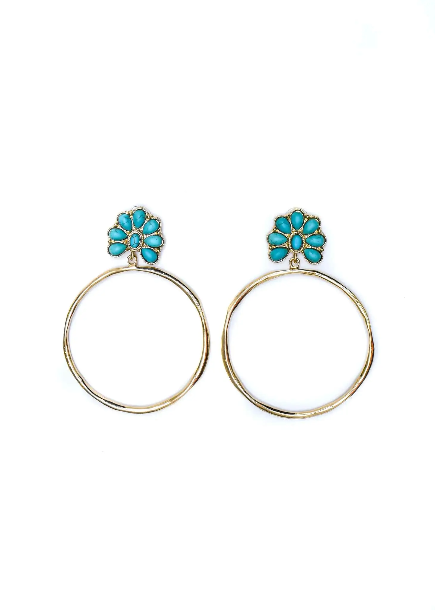 Gold Hammered Hoop Earring with Turquoise Flower Post.